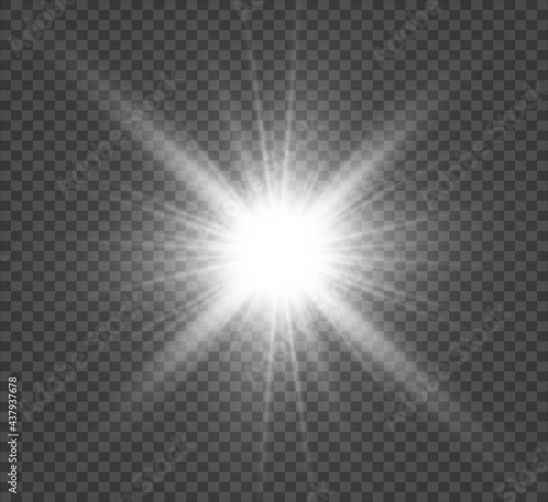 Special lens flash, light effect. The flash flashes rays and searchlight. illust.White glowing light. Beautiful star Light from the rays. The sun is backlit. Bright beautiful star. Sunlight. Glare.