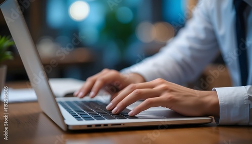Specialist's Hands Typing on a Laptop at a Cozy Office Table