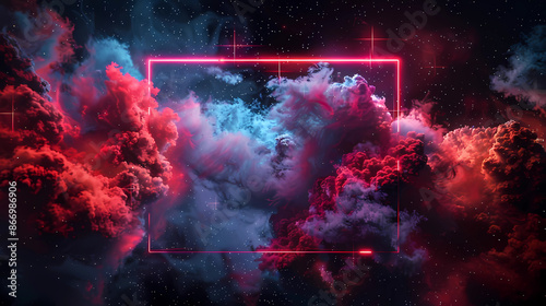 Spectacular cosmic cloud explosion within transparent square with black background. Colorful nebula and stars in space. Digital art for wallpaper and creative design, Generative AI.