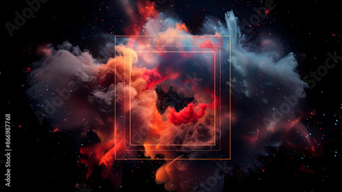 Spectacular cosmic cloud explosion within transparent square with black background. Colorful nebula and stars in space. Digital art for wallpaper and creative design, Generative AI.