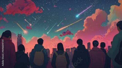 Spectacular Meteor Shower Over City Skyline at Dusk