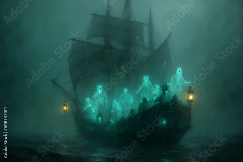 Spectral Galleon Amidst a Misty Sea, Haunted by Ethereal Apparitions, Navigating the Abyss with Lanterns Guiding the Way