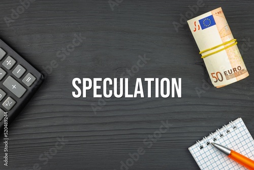 SPECULATION - word (text) and euro money on a wooden background, calculator, pen and notepad. Business concept (copy space).