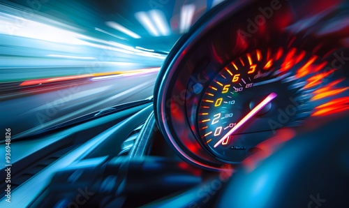 Speedometer scoring high speed in a fast motion blur racetrack background. Speeding Car Background Photo Concept.