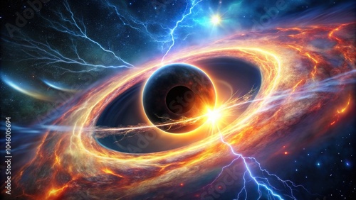 Spherical black hole with fiery accretion disk and lightnings in low angle view