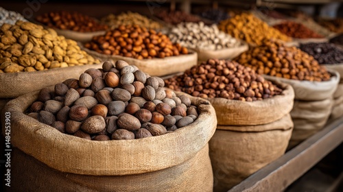 Spice Market Array: A vibrant display of assorted spices and nuts in burlap sacks creates a tapestry of culinary delight. Showcasing the rich colors, textures, and enticing aromas of the marketplace.
