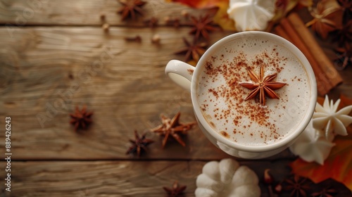 Spiced Chai Latte with frothy milk brewed with cinnamon and aromatic spices. Concept Warm beverage, Chai tea, Spices, Frothy