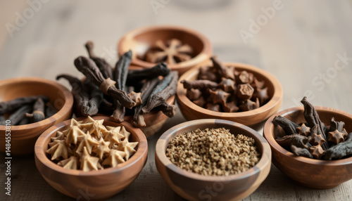 Spices and herbs arranged in small wooden bowls on rustic surface, including star anise, cloves, crushed pepper, and vanilla beans, creating warm and aromatic display