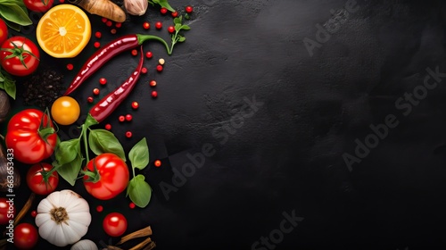 Spices and herbs over black stone background. Top view with free space for menu or recipes.