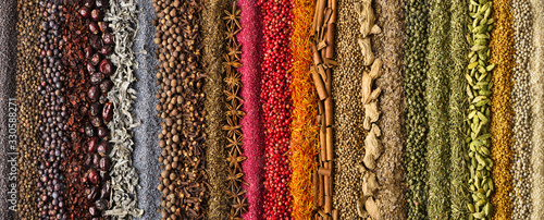 Spices scattered on the table, background for design. Colorful condiments as decoration of packing with food.