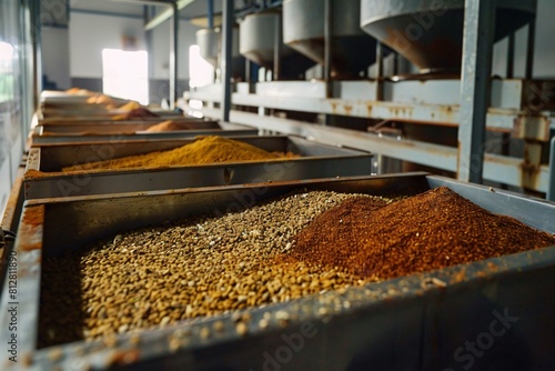 Spices that have gone through the grinding and blending process are waiting to enter the next mixing step. In the factory with machines