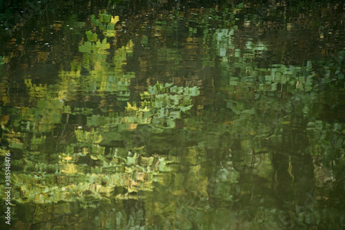 Spiegelung von Blattwerk mit Herbstfärbung im Wasser