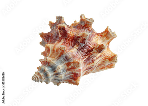 Spiky seashell with spiral shape and patterned surface isolated on transparent background, sea, nature, summer.