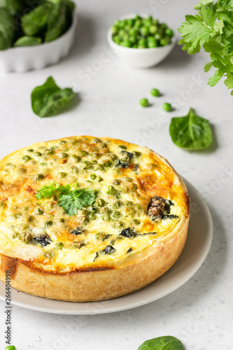 Spinach and green pea quiche, tart or pie with fresh ingredients for baking. Light grey background, copy space.