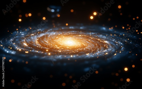 Spiral galaxy with glowing core and stars.