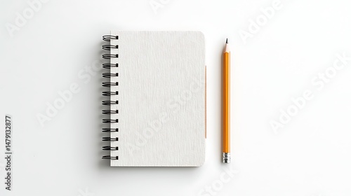 Spiral notebook with blank pages beside a yellow pencil, all on a white surface