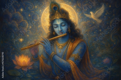 Spiritual artwork depicting Krishna's divine play with celestial wonder and mystical beauty