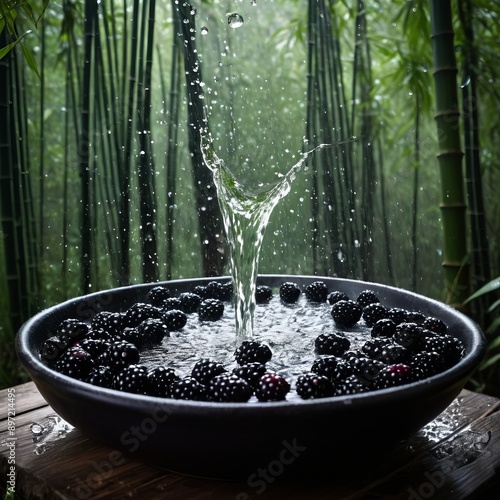 Splash water Blackberry surrounded by a flurry of transparent droplets, on a backdrop of a serene Zen bamboo forest.