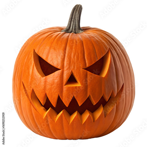 Spooky carved halloween pumpkin with a scary face and stem isolated on transparent background