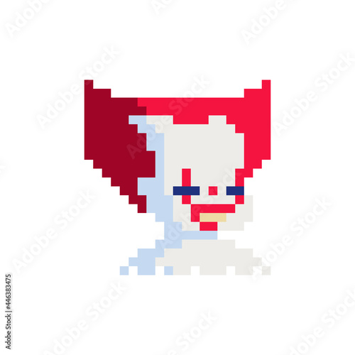 Spooky clown with red hair character. Avatar, portrait, profile picture. Pixel art. Flat style. Game assets. 8-bit. Isolated vector illustration.