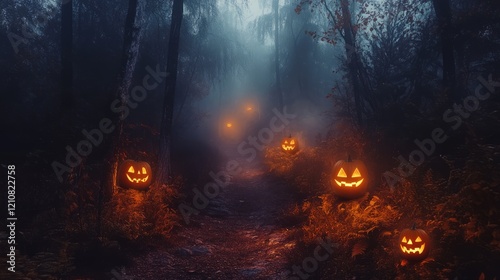 spooky forest path with glowing lanterns and jack-o-lanterns, foggy and eerie, high detail, mysterious and dark atmosphere, Halloween theme, rich orange hues