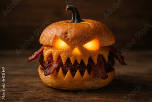 Spooky halloween burger with glowing carved pumpkin face, bacon strips, and beef patty on rustic wooden table at night