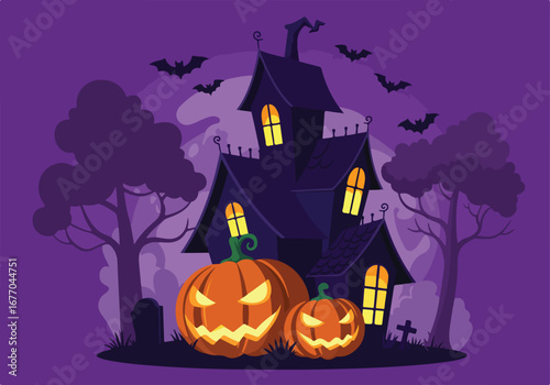 Spooky Halloween Night A Festive Scene of a Haunted House, Pumpkins, and Bats Silhouetted Against a Purple Sky, Evoking the Spirit of All Hallows' Eve