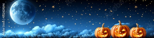 Spooky Halloween Night Scene with Jack-o'-Lanterns Under a Full Moon and Falling Snow, Creating a Mystical Atmosphere