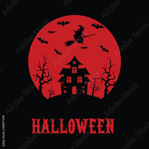 Spooky Halloween Night Silhouette with Witch Haunted House and Bats