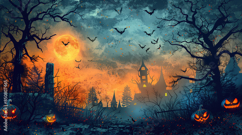 Spooky Halloween Night with Haunted House, Jack-O'-Lanterns, and Full Moon