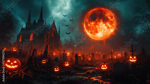 Spooky Halloween night with pumpkins and blood moon in haunted graveyard background