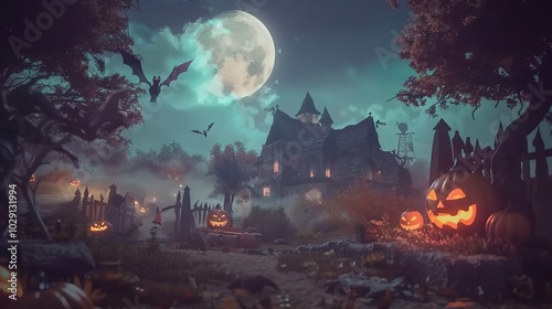 Spooky Halloween Scene Featuring Haunted House, Full Moon, and Foreground of Jack-o'-Lanterns, Ghosts, and Bats in Mysterious Low-Light Atmosphere