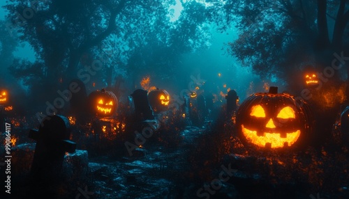 Spooky Pumpkins Glowing in Dark Forest with Eerie Mist and Haunted Atmosphere