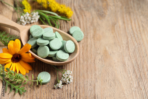 Spoon of pills, different herbs and flowers on wooden table, closeup with space for text. Dietary supplements