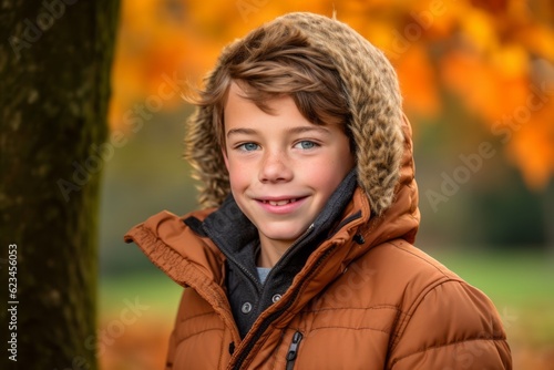 Sports portrait photography of a grinning boy in his 30s wearing a cozy winter coat against an autumn foliage background. With generative AI technology