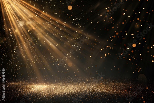 spotlight shines down from the top of empty stage, creating a golden light effect on a black background. A white beam with glittering particle and dust forms a sparkling trail for celebration or award