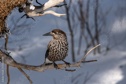 Spotted Nutcracker (Nucifraga caryocatactes) sitting on the perch