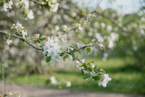 Spring apple trees in a blooming garden on a sunny day. The concept of agriculture.