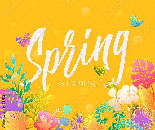 Spring background with paper cut flowers and leaves