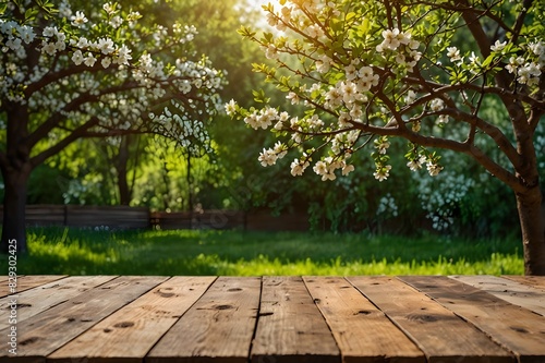 Spring beautiful background with green lush young foliage and flowering branches with an empty wooden table on nature outdoors in sunlight in garden.