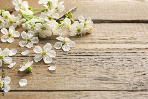 Spring branch with beautiful blossoms and petals on wooden table, closeup. Space for text