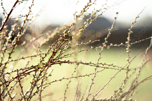 spring branches on a tree with swollen buds and small green leaves, selective focus, bokeh, soviet lens Helios 44-2