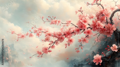 Spring Cherry Blossoms on a Mountain Landscape. Generative AI