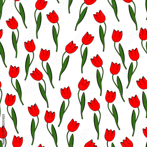 Spring colorful vector illustration with red tulips on white background. Cartoon style. Design for fabric, textile, wallpaper, posters, card, paper. Holiday print. Flowers with leaves.
