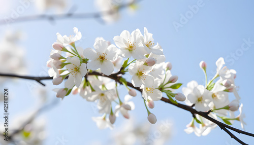 Spring day. Spring nature. Branches of blossoming cherry with soft focus on light blue sky background in sunlight. Beautiful floral image of spring nature. White flowers the fruit tree. with white s