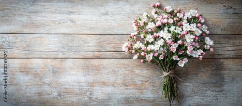 Spring flower bouquet of white and pink blossoms on textured wood table close up with copy space for rustic floral arrangements and decor.