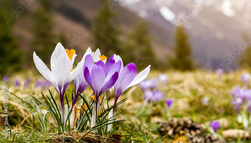 Spring flowers in the wild nature. Crocus in spring time. Copy space, ideal for postcard, watercolor