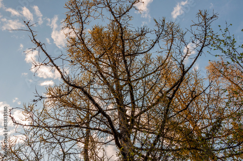 Spring forest with pines and spruces with short needles on the background with tender blue sky. Sunny day. Bottom view on the tree crowns
