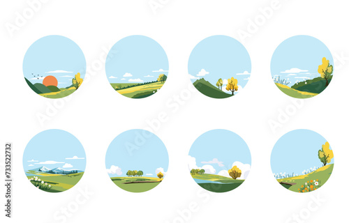 Spring landscape circle element set with mountain and tree Editable vector illustration for hilight social media