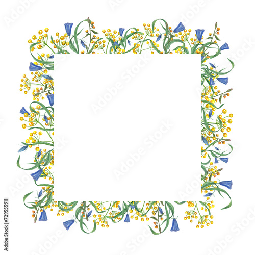 Spring meadow flowers. Square frame with copy space for text. Yellow, blue blooming flowers. Watercolor birthday illustration. For greeting, cards design, invitation template.
